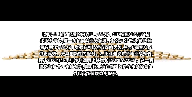 【昆仑万维与B端客户签订AI技术服务协议】 昆仑万维(300418)7月14日晚间公告,公司与北京蜜莱坞网络科技有限公司(简称“蜜莱坞科技”)就蜜莱坞科技向公司购买AI技术服务事项达成协议。蜜莱坞科技拟向公司购买的技术服务项目包括AGI Sky-Chat SaaS API服务及AIGC SkyPaint API服务,服务内容包括AI文本生成能力,AI图像生成能力,服务目的为支持蜜莱坞科技在定制大模型方向的技术落地,期限一年,总额不超过1500万元。此次协议签署,标志着公司“天工”大模型在互联网社交行业的正式落地,也体现了B端客户对公司在AIGC领域技术优势的认可,是公司AI业务商业化落地的重要开端。 【比亚迪上半年净利润同比预增192.05%-225.43%】 比亚迪(002594)7月14日晚间发布业绩预告,预计上半年净利润105亿元-117亿元,同比增长192.05%-225.43%。2023年上半年度,新能源汽车行业保持快速增长,公司新能源汽车销量在去年同期的高基数上实现强劲增长,市场份额持续提升,继续强化在新能源汽车行业的领导地位。 【华宝股份公司实控人及董事被解除取保候审】 华宝股份(300741)7月14日晚间公告,当日公司接到通知,长沙